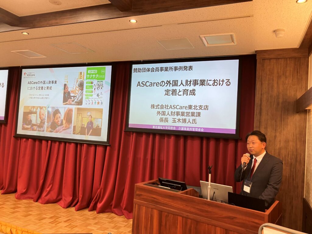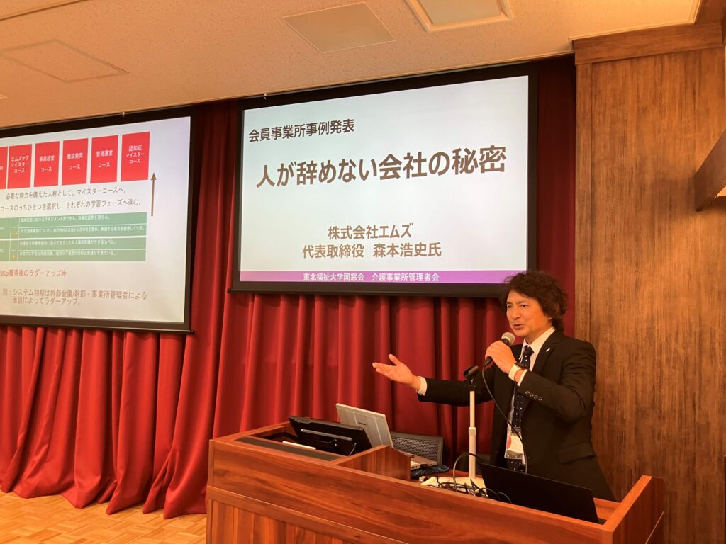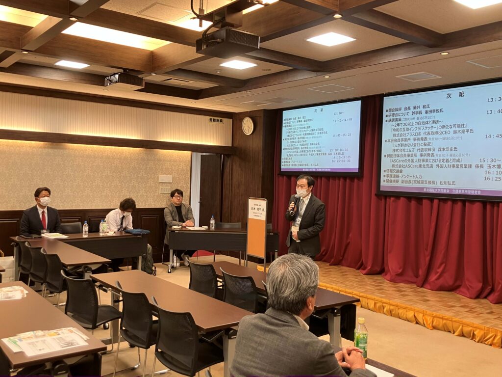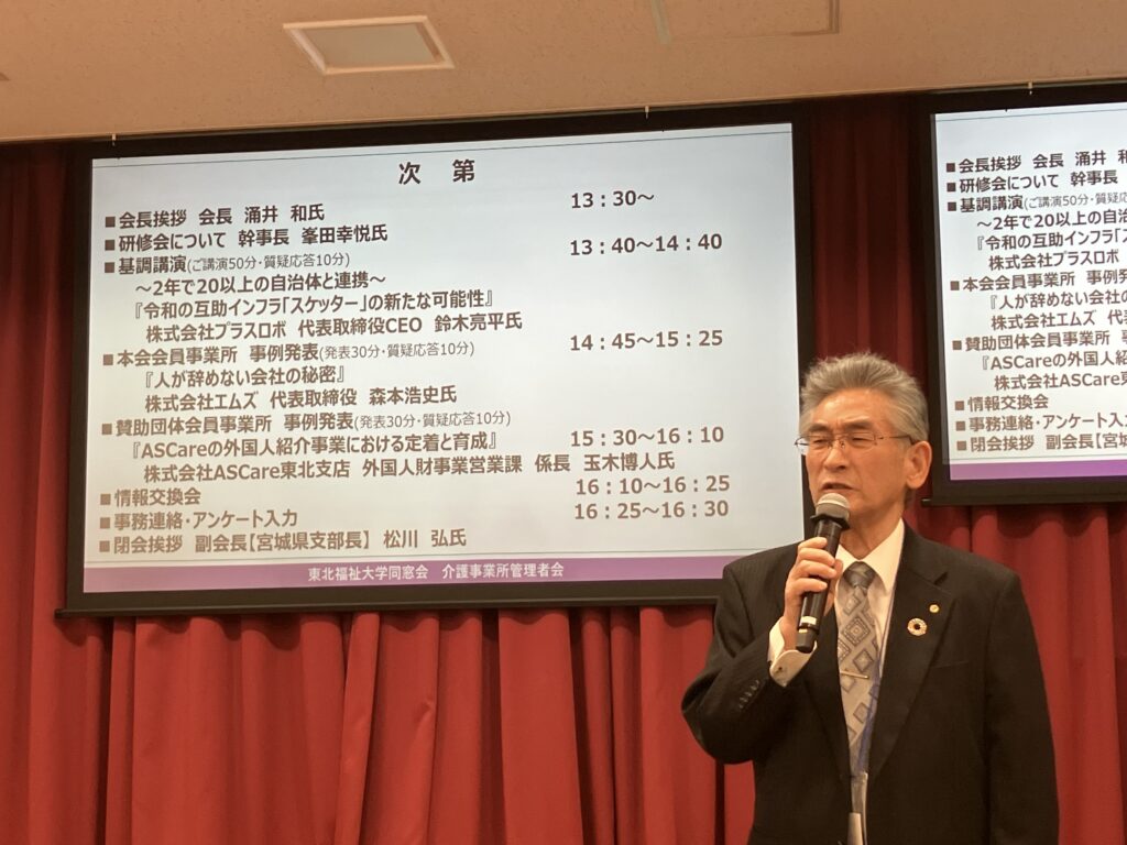 4月15日(水)午後に、東北福祉大学仙台駅東口キャンパスを会場として、令和8年度第1回研修会を開催しました。研修会のテーマ『人財獲得・定着の奥義』に沿った内容で、株式会社プラスロボの代表取締役CEO鈴木亮平様に『令和の互助インフラ「スケッター」の新たな可能性』についての基調講演を、会員事業所株式会社エムズの代表取締役森本浩史様、賛助団体会員事業所株式会社ASCareの玉木博人様より、事例発表講演をそれぞれ賜りました。年度頭の忙しい時期にもかかわらず、会員13名、賛助団体会員20名・紹介者等10名と多数ご参加いただき、人材獲得・定着にかかわる意見交換も行いました。